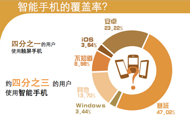 3、有 3/4 用户使用的是智能手机,1/4 用户使用的是触屏手机,塞班系统仍然占统治地位 - 47.02%,安卓 23.22,iOS 占 3.64%。