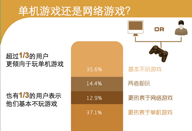 7、1/3 的用户在手机上倾向于玩单机游戏,也有 1/3 用户表示不玩游戏。