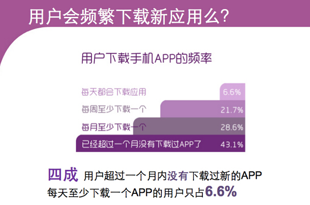8、有 4 成的用户,超过 1 个月没有下载过 app,只有 6.6% 的用户每天都会下载 app。