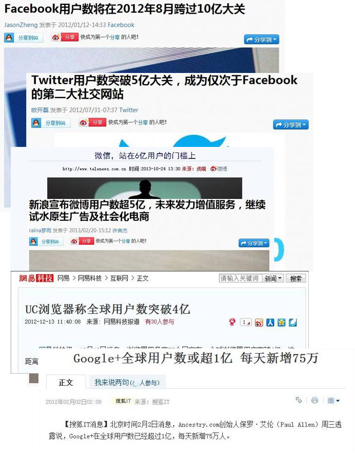 Facebook全球用户10亿;Twitter全球用户5亿;新浪微博用户数5亿;微信用户量6亿(全球);UC浏览器全球用户4亿;Google+全球用户1亿,每天新增75万;用户总规模达到近20亿,还在不断增长中……